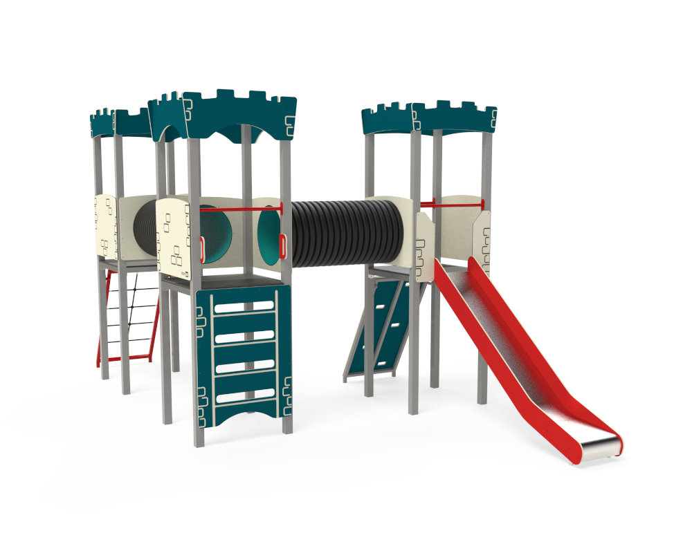Torngunga (artikelnummer BLFJ008) är en premium lekplatsanordning med litet fotavtryck som kombinerar en tornrutschkana och en gungställning. Ramen är av metall med ytbehandling för hög motståndskraft mot väder och vind, och huvudyta består av UV‑beständiga HDPE‑skivor. Rutschkanans yta är rostfritt stål med skydd mot fall, och tornet nås via ett repnät. På gungställningen finns två enkelgungor. Produkten är underhållsfri och uppfyller kraven i EN 1176‑1:2018, EN 1176‑2:2017+AC:2020 och EN 1176‑3:2018 – går att beställa i önskad färg.