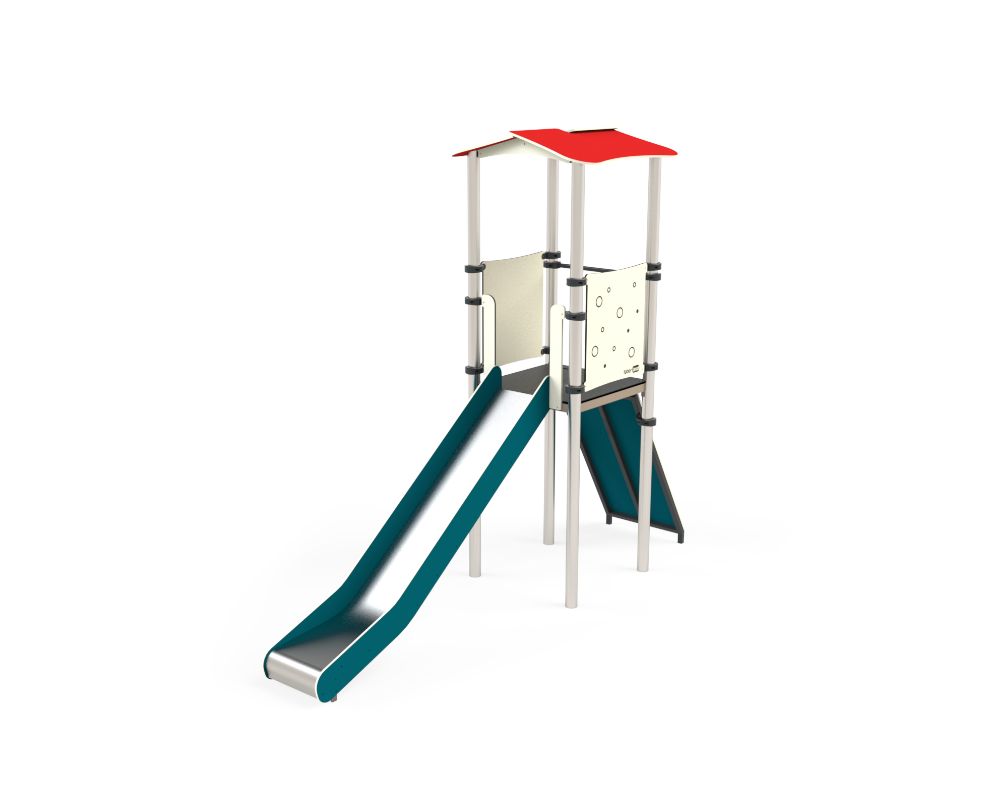 Barnen når plattformen via en stege och åker ned för rutschkanan som finns i två varianter – med yta i rostfritt stål (BLFJ021) eller polyester (BLFJ021P). Den kompakta designen och den låga användarkapaciteten gör den idealisk för yngre barn i åldern 2–12 år.