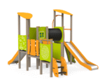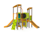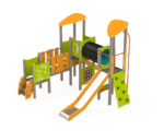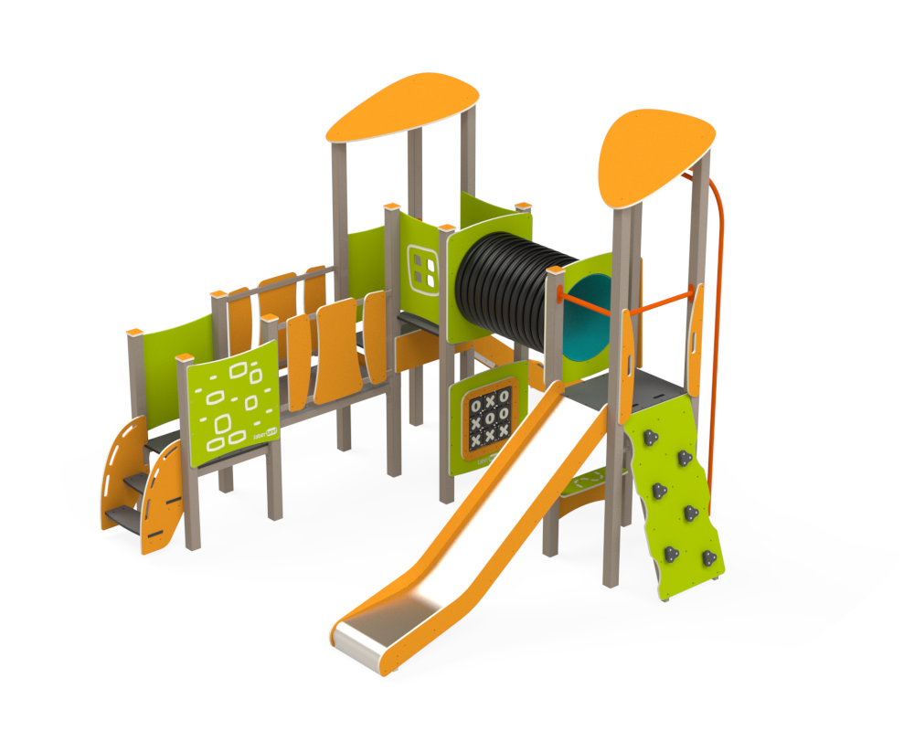 Eco Midi Lekborg (artikelnummer BLFJ040) är en lekplatsanordning med metallram och många lekfunktioner samlade i en kompakt design. Den är underhållsfri och erbjuder klättring, krypning, rutsch och interaktiv lek. Plattformarna har halkskyddande ytor i HDPE för säker användning. Utrustningen innehåller bland annat klättervägg med stenar, tunnel, brandmansstång, rutschkanor och interaktiva sidopaneler. Alla fästdon är i rostfritt stål för lång hållbarhet. Produkten uppfyller kraven i EN 1176-1:2017+A1:2024 och EN 1176-3:2018.