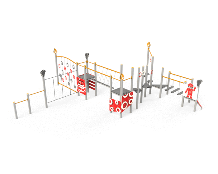 Banan innehåller balanssteg, kedjebro, gymnastikringar, klätterväggar, balansbommar och repklättring – allt utformat i olika svårighetsnivåer för att passa flera åldrar. Den uppmuntrar både fysisk aktivitet och kreativ problemlösning, precis som i en riktig brandinsats.